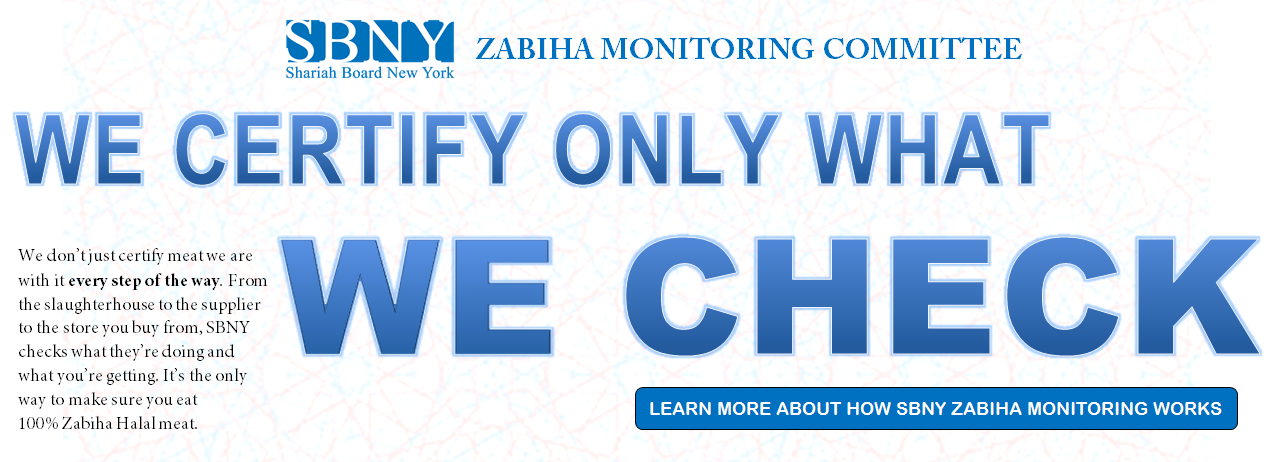 SBNY certifies and perpetually monitors slaughterhouses, distributors and retail locations that provide ONLY proper, hand-slaughtered zabiha halal meat.